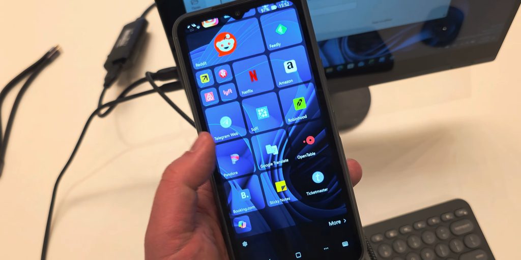 Conectat la un monitor și tastatură, telefonul poate deveni un desktop complet, într-un mod care amintește de Microsoft Continuum sau Samsung DeX, dar dus mult mai departe.