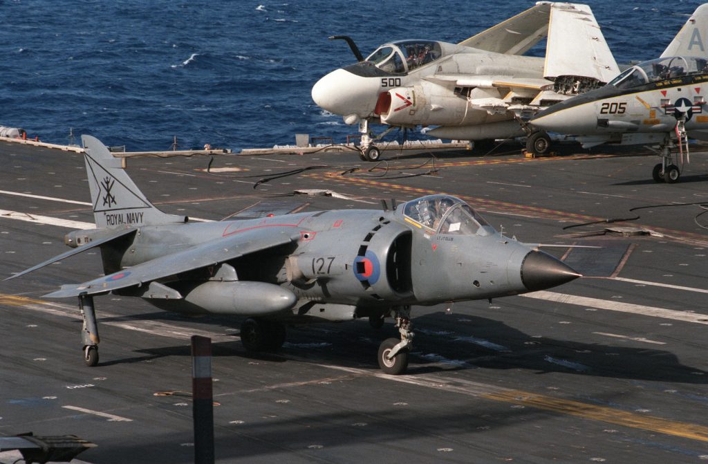 A British Royal Navy FRS.Mk 1 Sea Harrier aircraft taxis on the flight deck after landing aboard the nuclear-powered aircraft carrier USS DWIGHT D. EISENHOWER (CVN 69).