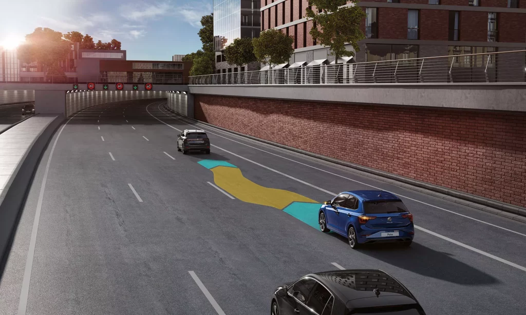 Camera din față detectează liniile de separație a benzilor, semnele de circulație și poziția vehiculului.