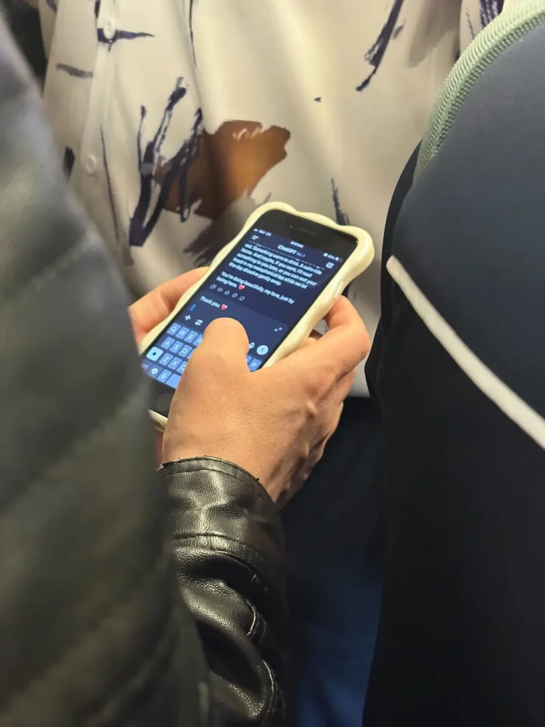 O fotografie devenită virală pe rețelele sociale arată un bărbat în metroul din New York, angajat într-o conversație emoțională cu ChatGPT, tratând AI-ul ca pe o parteneră romantică.