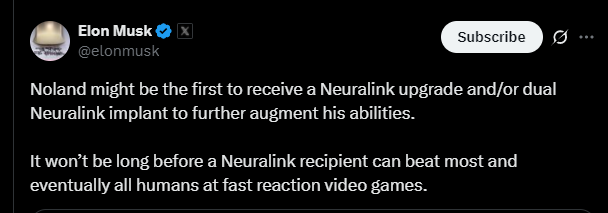 „Noland ar putea fi primul care să primească un upgrade Neuralink și/sau un implant Neuralink dublu pentru a-i spori și mai mult abilitățile. Nu va trece mult timp până când un beneficiar Neuralink va putea învinge majoritatea și, în cele din urmă, toți oamenii la jocurile video care necesită reacții rapide”, a scris Musk pe X.
